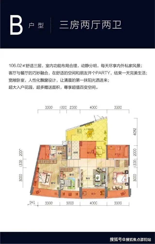 106.02㎡宽敞三居,室内功能区分明确,动静分明,每天独享内外私家风景。客厅与餐厅融汇相通,在舒适的空间内开个PARTY,尽显主人心境;宽奢卧室,人性化飘窗设计,让清晨的第一抹阳光洒进来;超大入户花园,超多赠送面积,尊享超值百变空间。