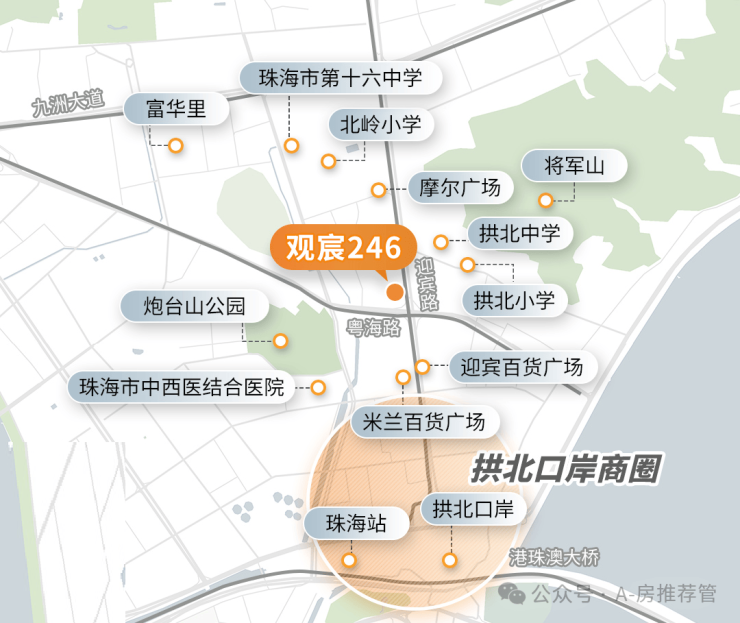 观宸246,位居拱北口岸头排,珠澳同城核心板块,城市中心+口岸物业双极加持,近10年来距离拱北口岸、港珠澳大桥口岸最近的纯住新盘,左手澳门世界级休闲娱乐配套,右手拱北城市烟火生活,坐享醇熟配套,畅享港珠澳三城无界生活。