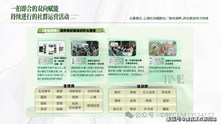 可持续增值的圈层生态链,26个社群业主共创,从露营社、心理社到樾跑社,社群自转力持续,同频之友感受湖居之乐。