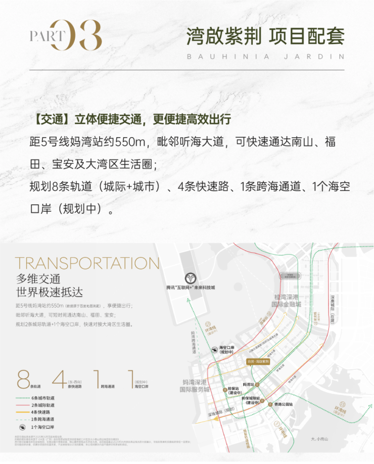 单价:预计10万左右交付标准:精装修交付时间:2027年6月30日车位:超1:1(595个)管理费:9.5 元/m²开发商:自贸投资(招商局+前海管理局)项目位置:听海大道与妈湾一路交汇处(5号线妈湾站约550米)