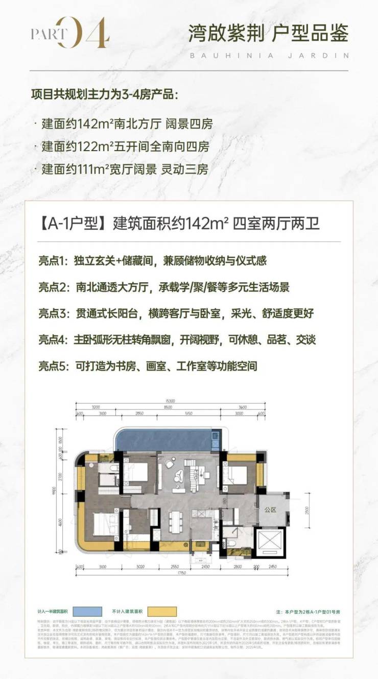 自贸湾啟紫荆(备案名:湾啟紫荆府)项目基础信息项目占地:约1.5万容积率:约4.47产权年限:70年(2024-2094年)项目总套数:3栋住宅可售户型:约96-142m²3-4房高楼层:36-37层层高:3.1米梯户比:4梯5户总户数:485 户(首推320套)管理费:9.5 元使用率:92-100%