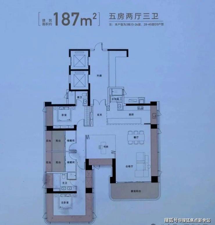 建面约187㎡五房两厅三卫,得房率约111%(包含赠送),西南朝向看海景景观。双套房设计。