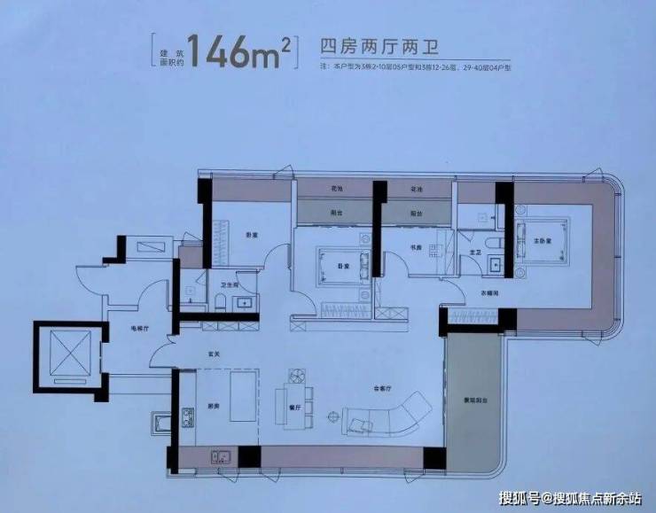 建面约146㎡户型,得房率约105%(包含赠送),东南朝向看海景景观。可视为127㎡户型的升级放大版。