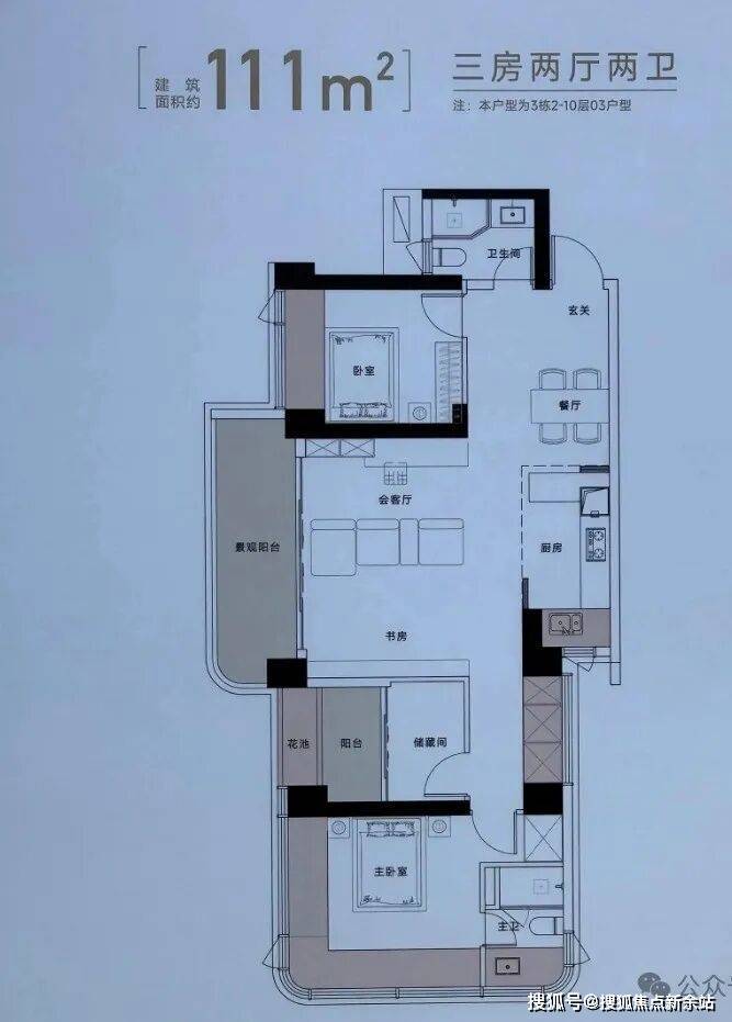 建面约111㎡户型,得房率约94%(包含赠送),西北朝向看一线梧桐山景观。跟102㎡户型布局有点像,也是长条形……