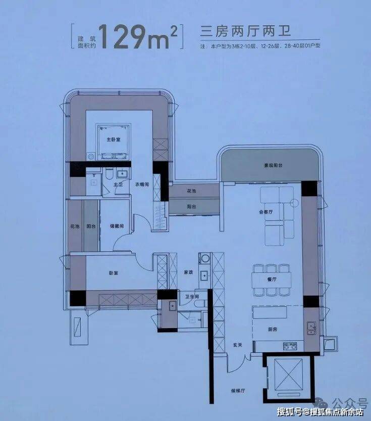建面约129㎡户型,得房率约105%(包含赠送),东北朝向看一线梧桐山景观。跟127㎡户型只差了2㎡,格局却千差万别。