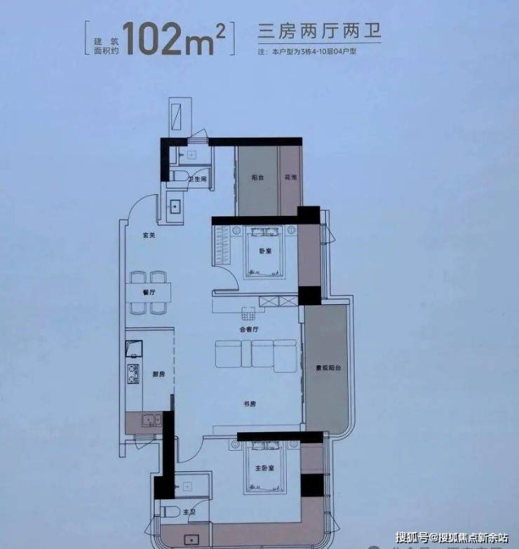 建面约102㎡户型,得房率约94%(包含赠送),东南朝向看海景视野。形状为长条形,虽然标注了是三房两厅两卫,实际报建的只有两个房间。