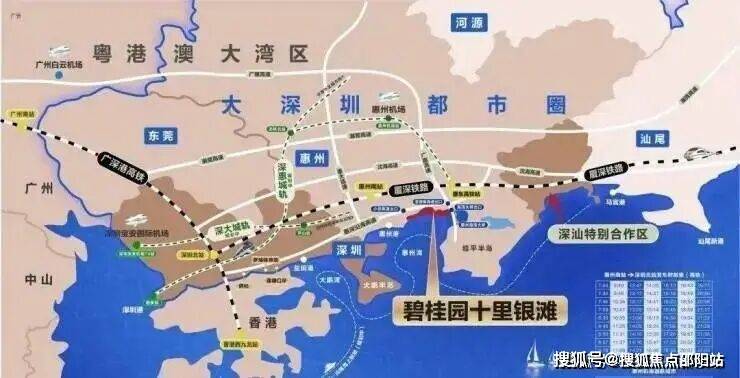 1个交通中心,每日多班次城际巴士往返深圳福田、罗湖、莲塘(目前十里银滩已有13000户香港业主,过关口岸更是有城际巴士直达碧桂园维港半岛;业主坐巴士单程仅需9.9元);2大高铁,惠阳站、惠东南站;3高速口,小径湾出口、亚婆角出口、其中维港半岛距海湾大桥管理中心出口仅1公里(直线距离),速达深圳,畅通粤港澳。