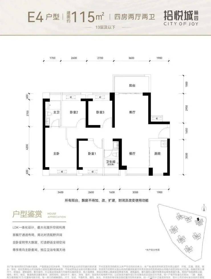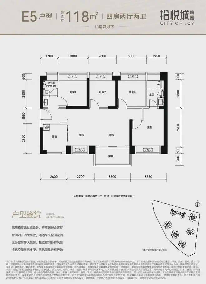 115平~118平全明采光户型,四卧室、厨房、两卫、客餐厅等均设计超大采光面,带来明亮通透的舒适居感,客餐厅以横厅布局,让家庭居住空间的视野范围和活动区域扩大,加强家庭成员之间的情感交流;不论是三代同堂的天伦之乐,亦或是四口之家的温馨时刻,皆能一步到位。