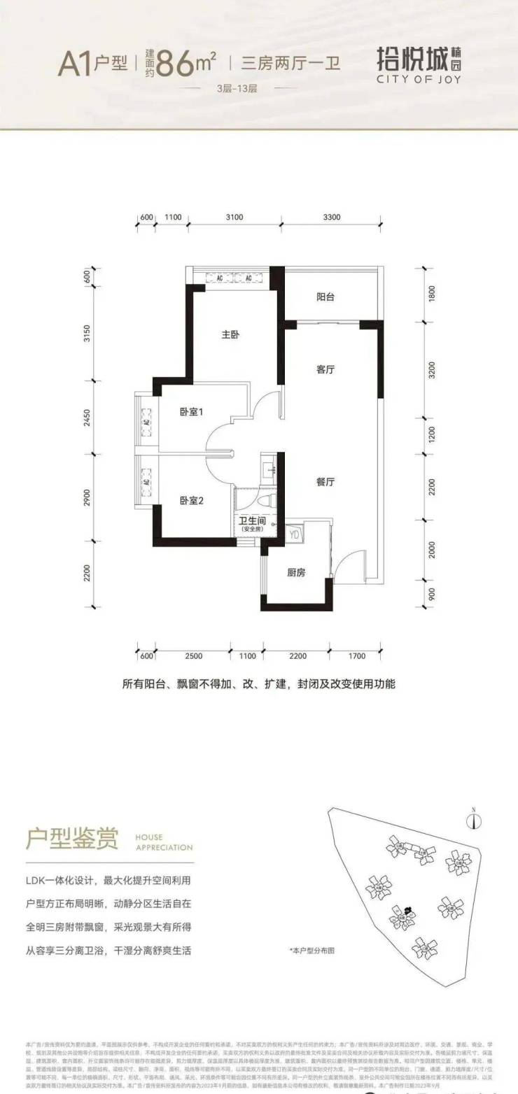 86平三房:设计的是竖厅格局,进门入户玄关,客厅3.3米开间,LDKB一体化设计,3个卧室分别做到了3.1米/2.9米/2.45米的宽度,U型厨房,卫生间三段式分离,得房率:76.92%(不含赠送),阳台1.8米宽度,东北朝向。