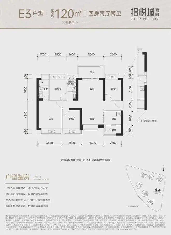 120平-140平,设计的是横厅南北通透格局,进门入户玄关,客餐厅6.3米开间,无过道设计,4个卧室分别做到了3.55米/3米/3米/2.8米的宽度,U型厨房,公卫三段式分离,得房率:74.31%(不含赠送),阳台1.8米宽度,主朝西南或东南向。