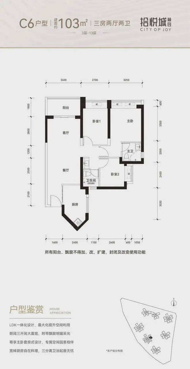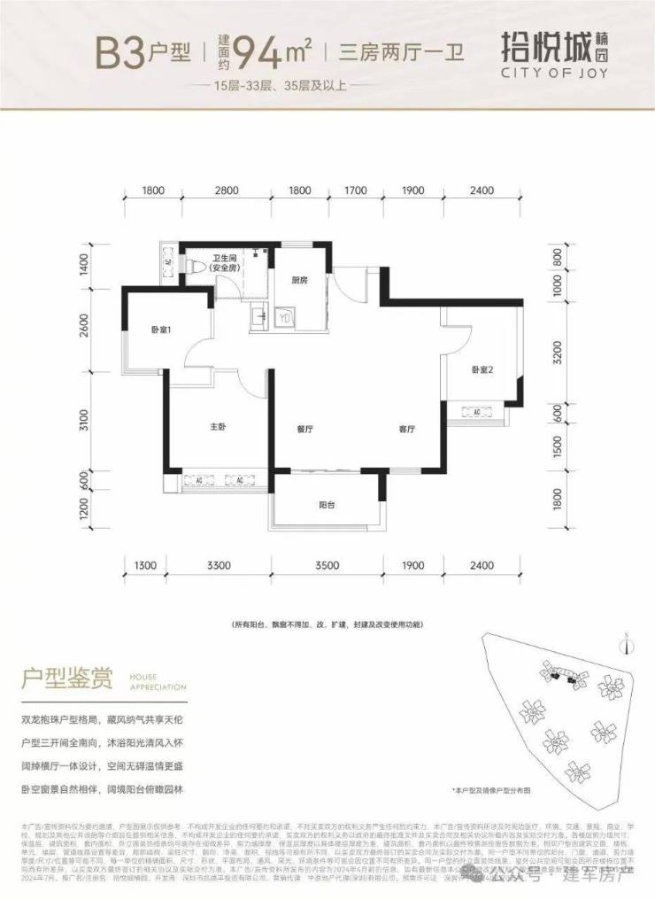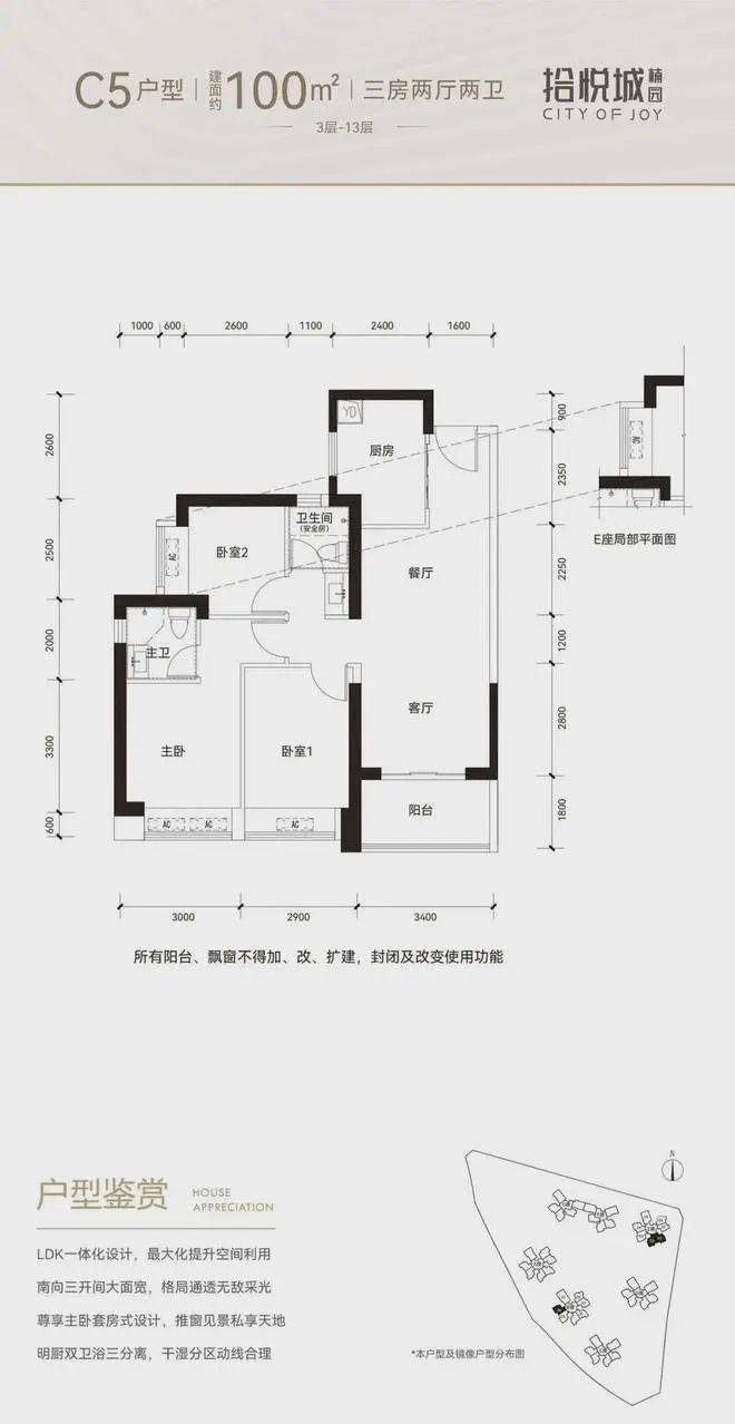100平三房:设计的是竖厅格局,进门入户玄关,客厅3.4米开间,LDKB一体化设计,3个卧室分别做到了3米/2.9米/2.5米的宽度,U型厨房,公卫三段式分离,得房率:77.14%(不含赠送),阳台1.8米宽度,西南或东南朝向。