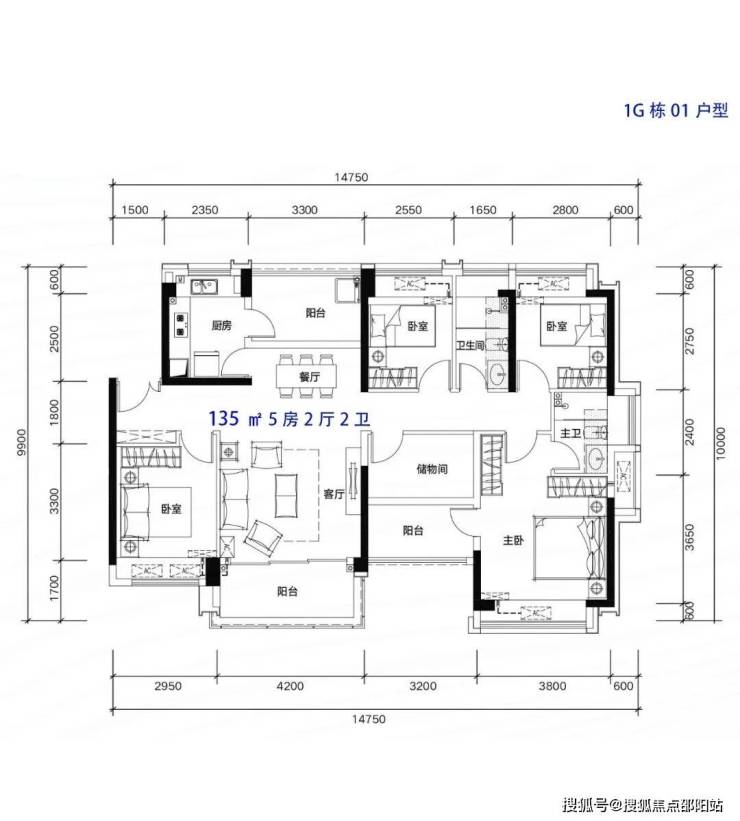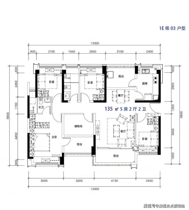135m²5房2厅2卫,南北通户型,客厅开间4.2米,都有阳台改卧室以及餐厅改造,赠送后得房率在96%左右。
