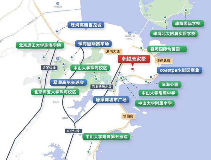 项目周边是一个纯粹的住宅区,5-10分钟车行范围内,足以尽享周边的资源,一切应有尽有。其紧挨情侣路,2公里左右又可到港湾大道,约20分钟便可通达老香洲、吉大等核心区域,它未曾脱离繁华,一直保持着最合适的距离。