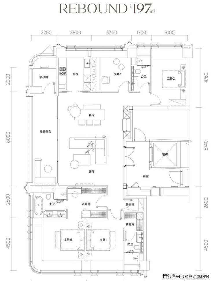 项目占地14969.93㎡,是过去饼干厂旧改,住宅没有7090限制,面积段为188-246㎡精装大平层。由4栋住宅组成(3栋商品房+1栋回迁房),商品房总计261户,户均218㎡,主打188-247㎡ T2、T3高端改善户型。