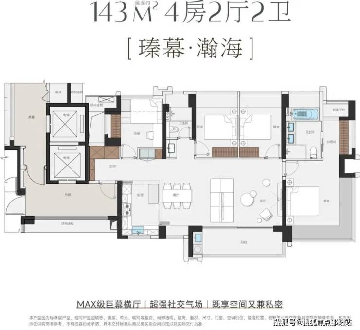 户型方面,主推建面115㎡-143㎡四房,户型使用率超100%,最大可达108%,最高赠送面积近44㎡。