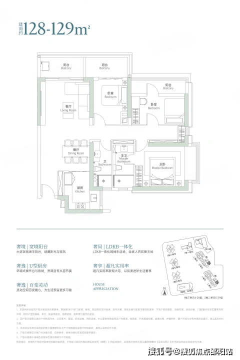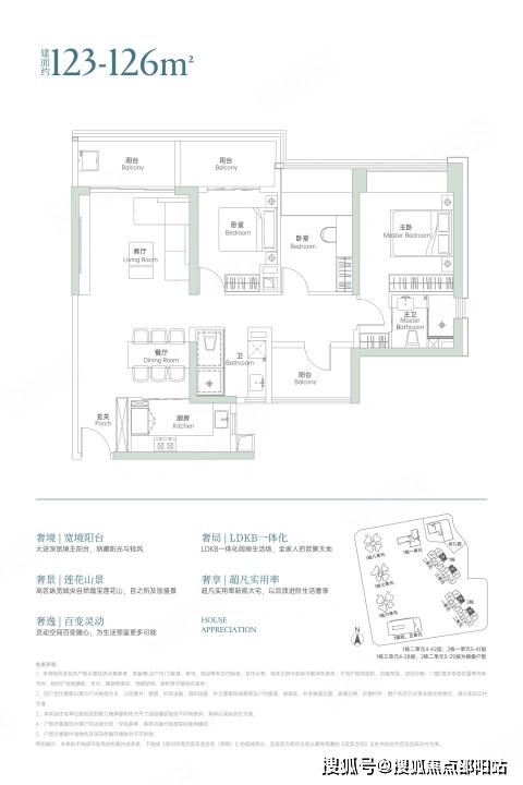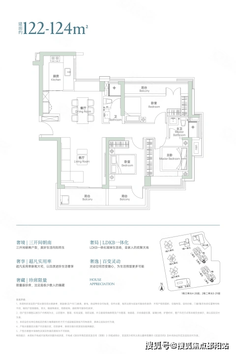 122-124㎡ 和 123-129㎡ 户型均设计为四房两卫,前者为通透4房,后者为竖厅4房。这些户型均采用南北通透设计,朝南向,光线充足、通风好。
