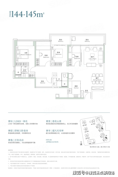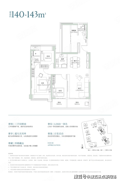 140-145㎡ 户型同样设计为四房两卫,采用竖厅设计。空间更为宽敞,部分高层可享香蜜湖景观,主卧采用套房设计提升居住私密性。