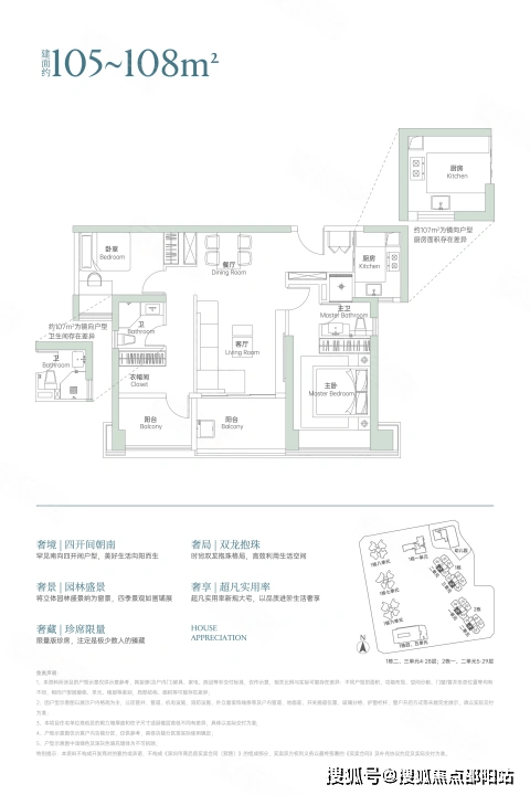 105-108㎡ 户型设计为三房两卫,采用“双龙抱珠”布局。这类户型适合刚需和刚改家庭,空间布局合理,做到了干湿分离、动静分离。
