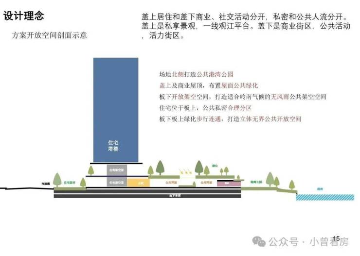 通过盖板设计造就的盖上私密园林、盖下滨江商业带,叠加270°环幕滨江会所和公共港湾公园,真的很city了。