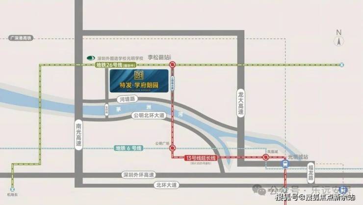 项目作为纯正地铁口物业,交通优势堪称刚需福音。距在建地铁13号线二期(北延)公明北站直线距离仅150-200米,该线路预计2025年底通车,作为纵贯光明、宝安、南山的“高新技术人才专线”,通车后7站直达南山科技园,30分钟可达南山核心区,45分钟通达深圳湾口岸,完美适配南山上班族通勤需求。更值得期待的是,公明北站同时为规划中26号线(国际机场专线)终点站,未来可快速衔接深圳机场及粤港澳大湾区城市群,轨道交通价值持续升级。