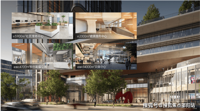 ⑤配置约4700m²科创配套空间、建面约5900m²社区服务中心、建面约2000m²健康服务中心于一体,毗邻建面约14000m²文体中心