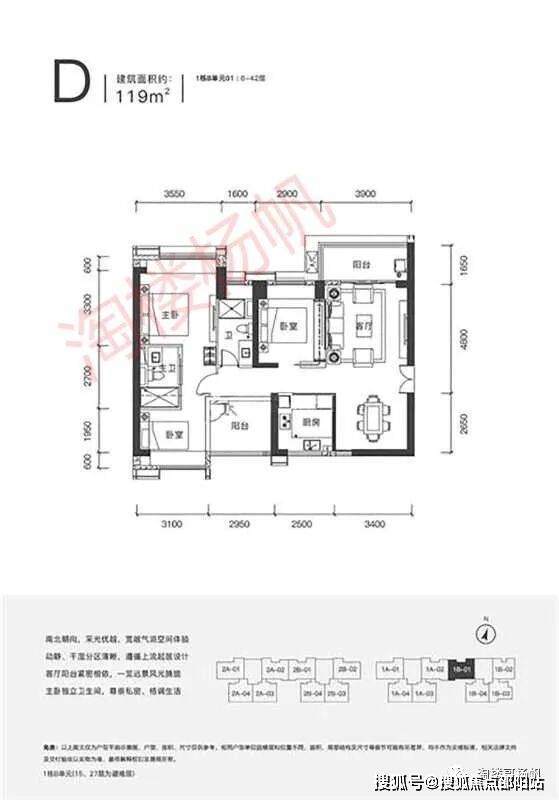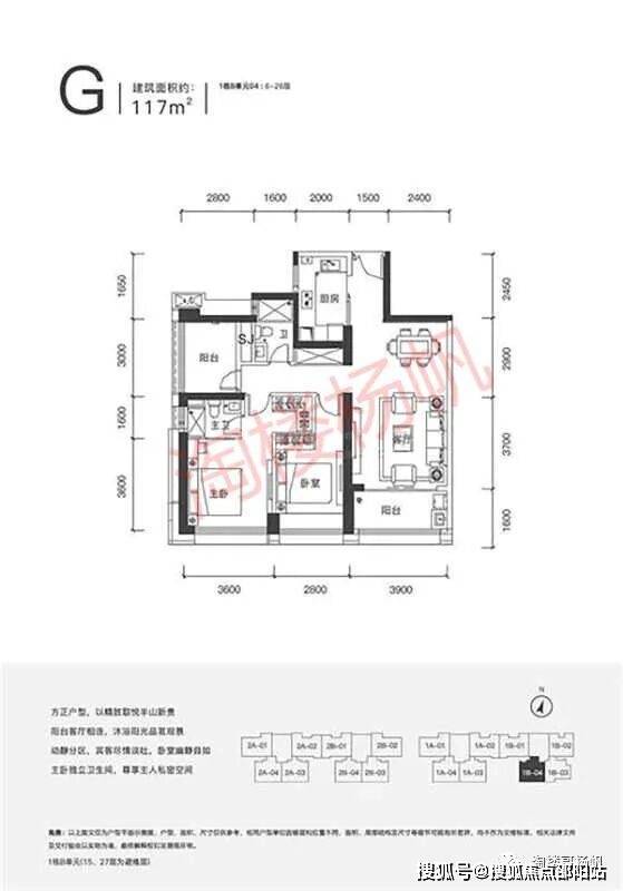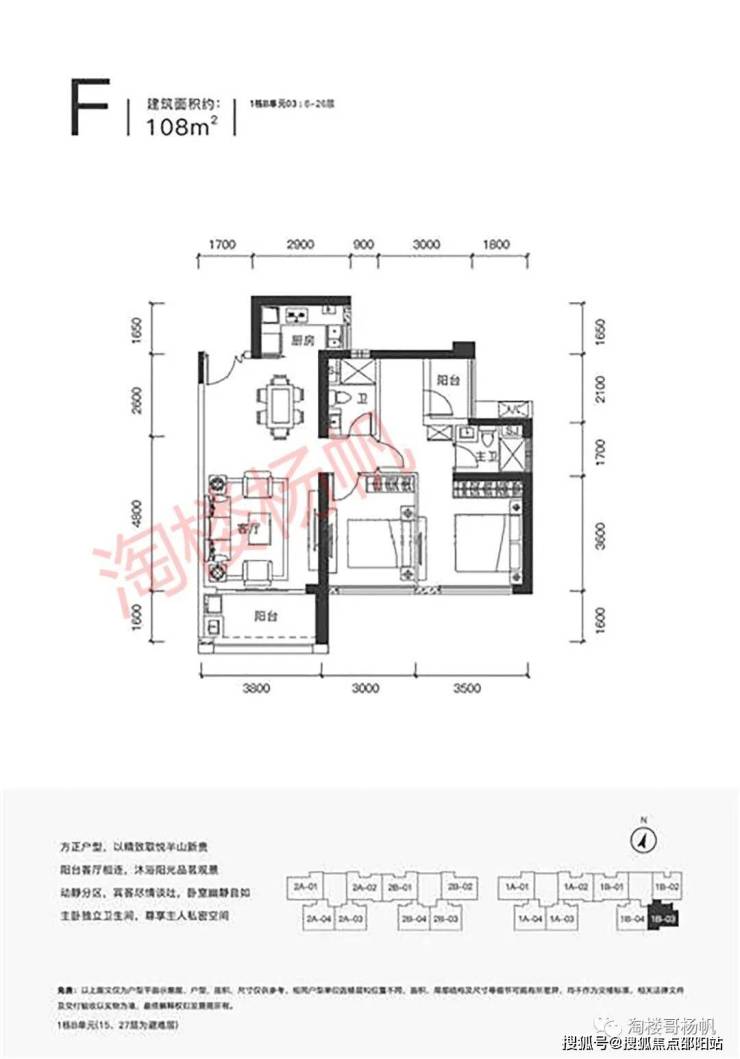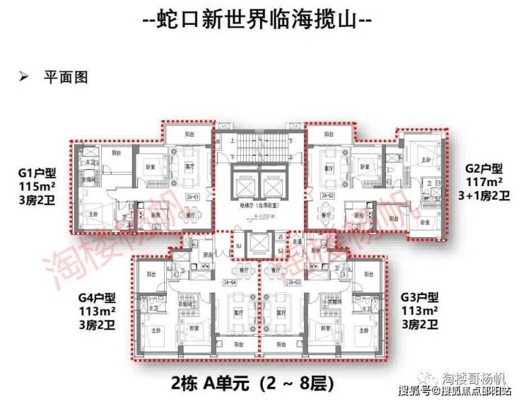 从2栋A单元(与1栋呈对称分布)户型分布来看,27层及以下南向突出的为建筑面积约115㎡的3房单位;