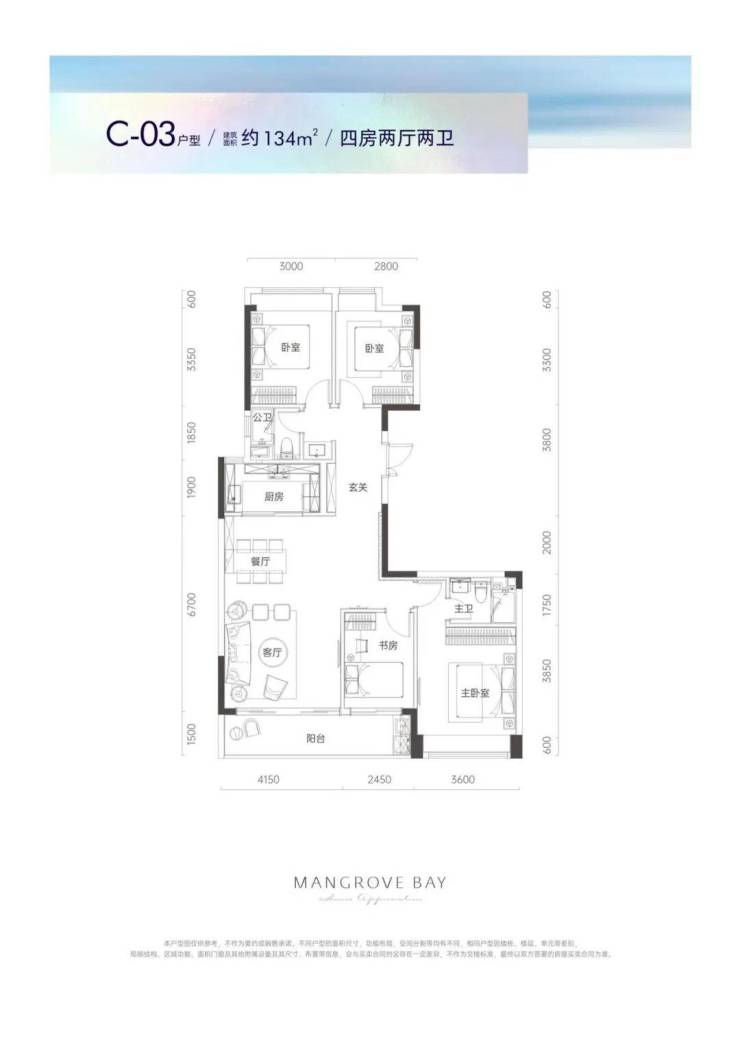 A02户型76平2房2厅1卫:房间和客厅朝南向,采光充足;约5.8米开阔观景阳台,俯瞰红树林自然生态;动静干湿自然分离,生活有序互不干扰。F01户型93平3房2厅1卫:客厅、餐厅连通阳台,自然采光充足;宽景竖厅,空间开阔;主卧独立卫生间,隐私雅奢生活;动静干湿分离。G01户型112平3房2厅2卫:同样拥有客厅、餐厅连通阳台的设计,自然采光充足;全屋飘窗,尽享超大采光面;主卧独立卫生间;动静干湿分离。C03户型134平4房2厅2卫:方正紧凑格局,合理精研每一寸空间;独立私家书房;约6.6米宽阔景观阳台;客厅、餐厅连通阳台;主卧飘窗。