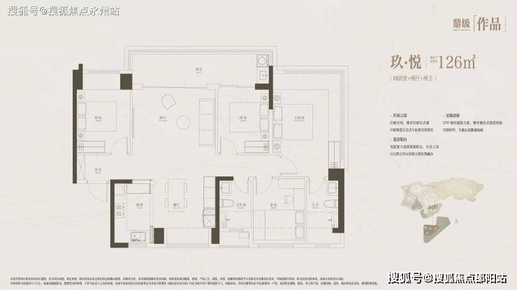 126㎡经典四房:采用 LDKB 一体化设计(客餐厅+厨房+阳台联动),三开间朝南,面宽达12.6米,进深仅10.8米,得房率约95%。