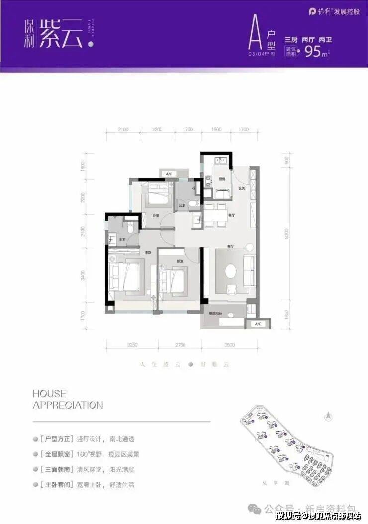 项目洋房采用“Y”型全南向设计,户户朝南,通风采光俱佳,全飘窗设计,高拓展面积,生活更舒适,满足全生命周期需求。