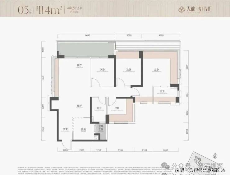 114㎡4房2卫,竖厅户型,朝北对着金众,户型结构和113完全一样,就是客厅也做了一面4.5米宽的凸窗;