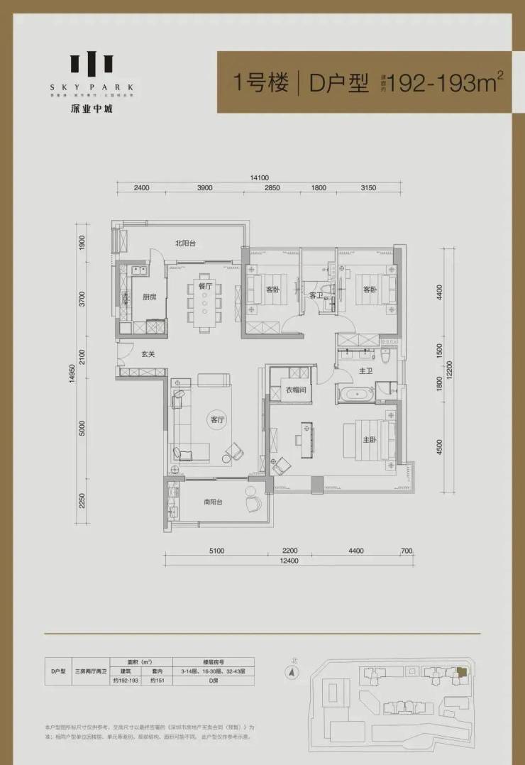 住宅共有三栋,2/3栋为28-29层,合计192套住宅;1栋为43层,共222套。