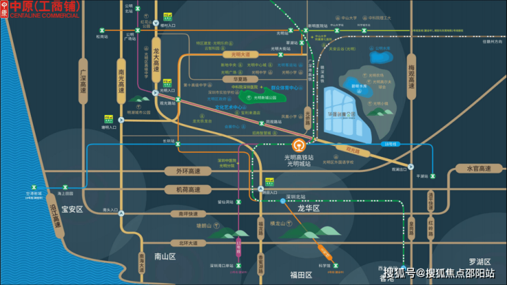 两高铁线交汇:紧邻光明城高铁站,汇聚广深港高铁线与赣深高铁线(在建)。