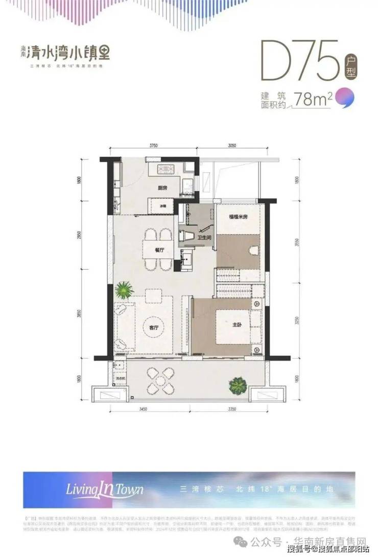 ①两房 D75 面积约78㎡,阳台面积约10㎡