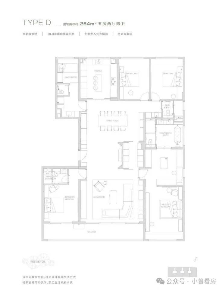 264为五房两厅四卫产品,更细腻的产品设计,超奢华四件套南向主卧,标准南向次主卧, 6.6米巨型方厅,纵向超长LDK一体化空间,专属家政保姆空间,超大容量收纳空间,令居住的尊贵从每处品质细节里流露而出,创造独一无二的奢享体验。