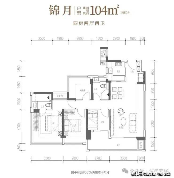 104㎡的4房2厅2卫,设计的是竖厅格局,客厅4.15米开间,LDKB一体化设计,预留冰箱卡槽位,四开间朝南,动静分区,主卧270°无柱转角飘窗还带1个设备平台约1.52平,卫生间干湿分离,得房率约100.71%(包含赠送),客厅连接次卧出大阳台约11.23平,西南朝向。