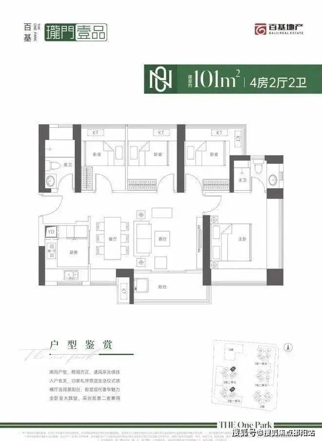 101㎡的4房2厅2卫,设计的是横厅南北通透格局,进门入户玄关,客餐厅5.55米开间,LDKB一体化设计,四开间朝南,4个卧室分别做到了3.85米/2.6米/2.4米/2.35米的宽度,主卧270°双飘窗,U型厨房,卫生间干湿分离,得房率:71.29%(不含赠送),阳台主朝东南向。