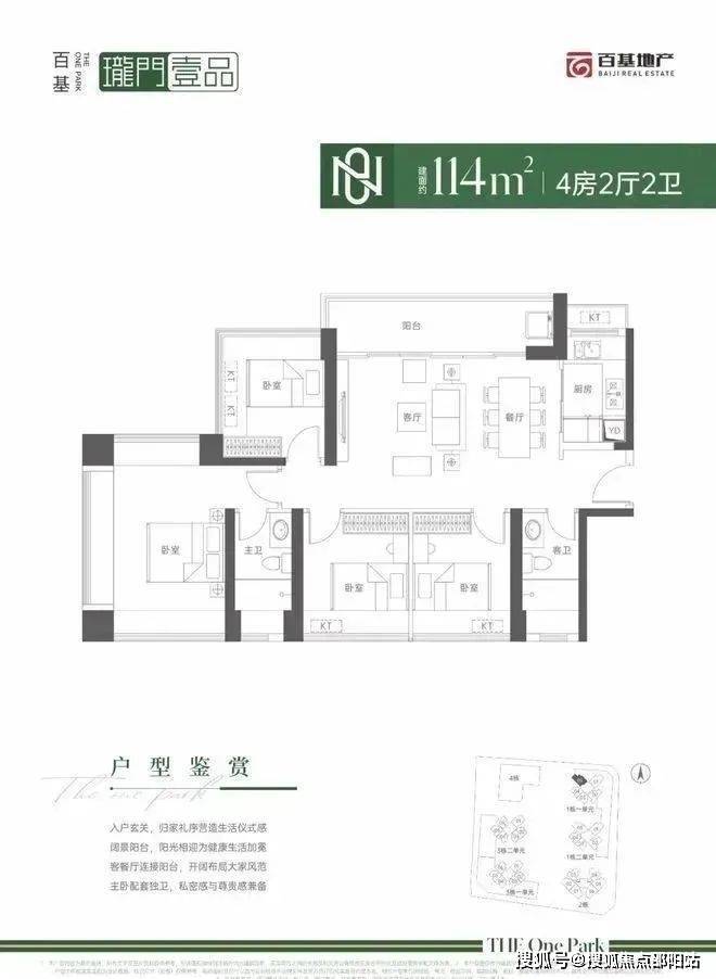 116㎡的4房2厅2卫,设计的是横厅南北通透格局,进门入户玄关,客餐厅6米开间,LDKB一体化设计,五开间朝南,4个卧室分别做到了3.775米/3.2米/2.6米/2.575米的宽度,主卧三面飘窗,6米长的大阳台,L型厨房,卫生间干湿分离,得房率:70.65%(不含赠送),阳台主朝东南向。