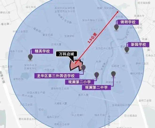 万科启城家园自带幼儿园学校、毗邻龙华区第三外国语九年制学校,另外万科启城家园观澜二中、观澜二小距离万科启城家园也都不远。万科启城家园1.5公里范围内还分布有锦明学校、新园学校、精英学校等。