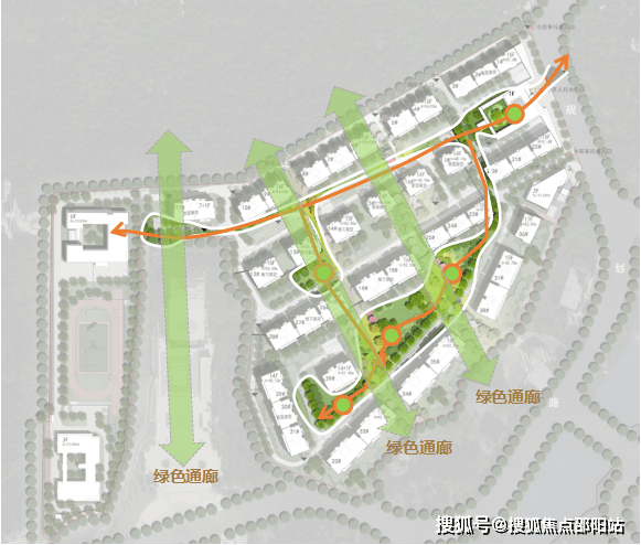 出入口正对中央景观,东南侧则设置次要出入口与幼儿园出入口,以不同的高度差分隔各个流线,使其不会相互交错,造成交通组织混乱。
