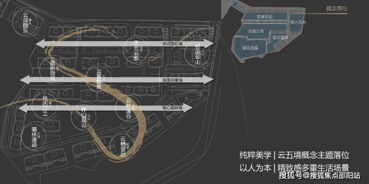 以三条景观归家轴线(休闲放松轴、邻里共享轴、核心森林轴)、五个云中之境(初入云林、登云望林、观云流溪、云庭之境、隐享云山)、十个精致生活花园(初见云山、云林溪谷、云栖望远、伴山观云、林闲汀兰、晴林漫道、疏影微风、云雾雅集、天光云影、云深隐乐)为整体园林布局,构建精致感多重生活场景。同时以三级绿廊步道(快速归家动线、景观归家动线、场地游园小径)串联整个园区,景观节点延步道分散排布,做到楼楼是核心,栋栋有花园。