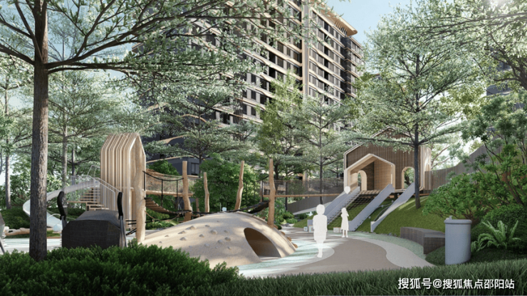 林荫儿童游戏场,采用生态材料布置圆木桩、森林穿梭、树屋主题器械等设施,丰富的植被体系、自然环保的砾石铺设,让孩子们能更安心舒适的在自然中协作与冒险。穿梭与林下,与自然相契合,多形态的灌木形式、自然堆叠的原木设施,建造一片承载着欢声笑语、释放天性的童趣世界。