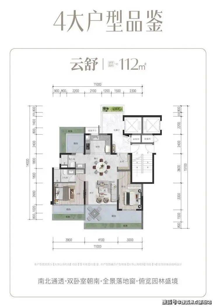 建面112㎡云舒户型:南北通透,双卧室朝南搭配全景落地窗,俯览园林盛境,空间利用率高,适合三口之家旅居。
