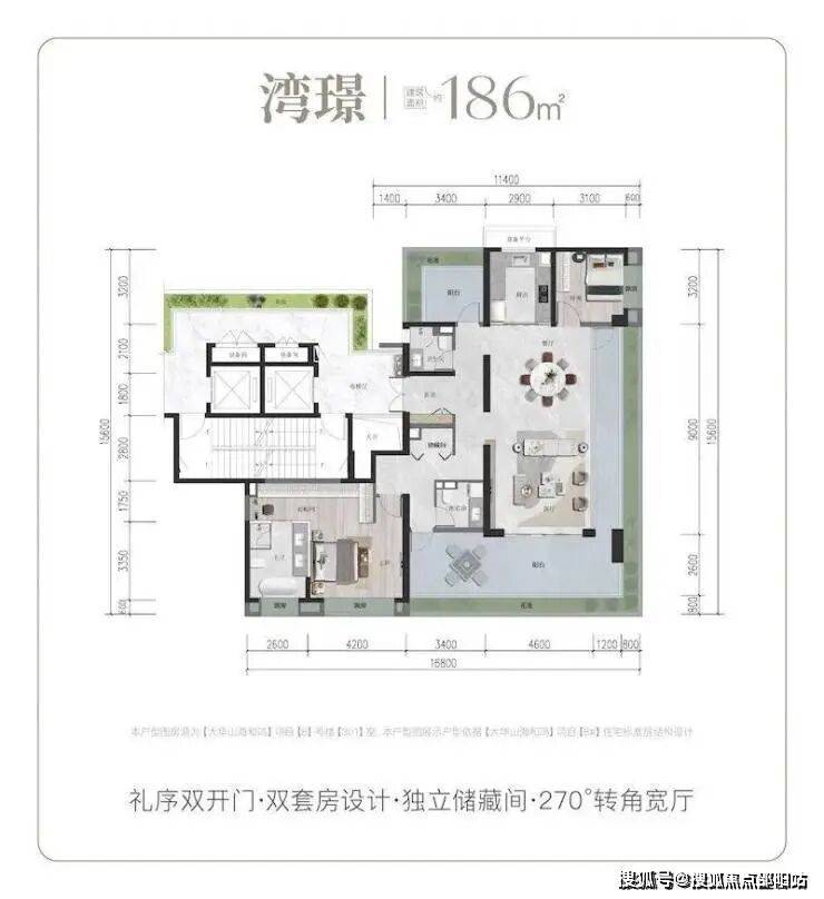 建面186㎡湾璟户型:礼序双开门设计,双套房布局搭配独立储藏间,270°转角宽厅尽显奢阔,满足高端旅居需求。