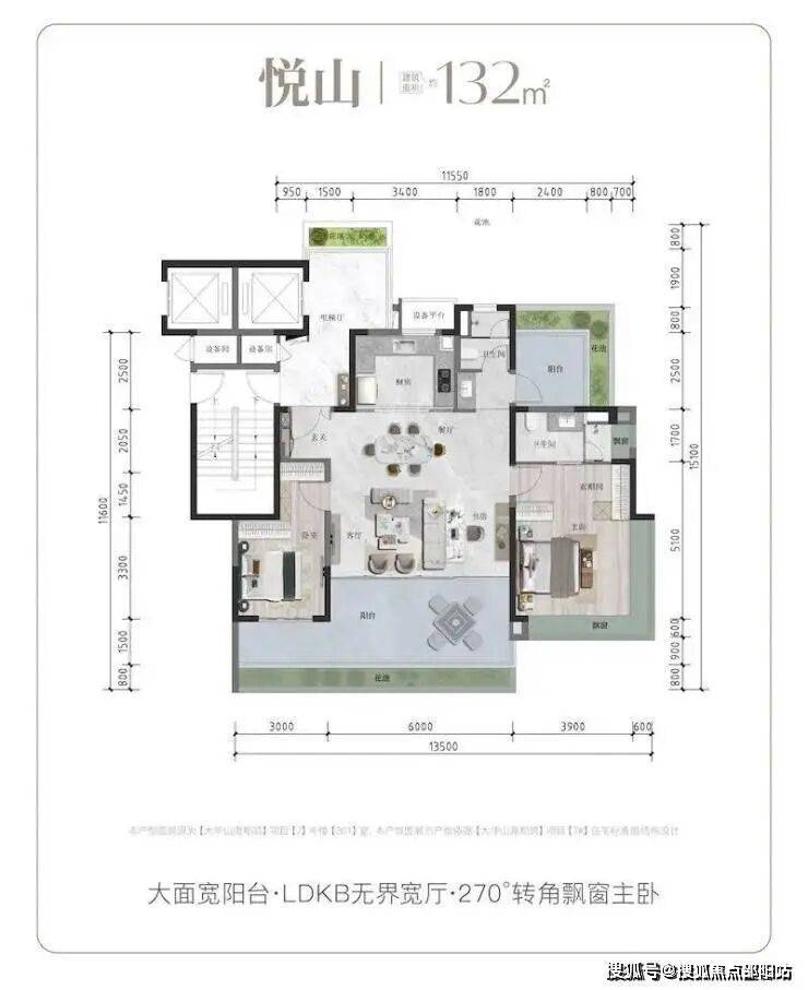 建面132㎡悦山户型:LDKB无界宽厅设计,大面宽阳台延伸生活空间,主卧270°转角飘窗,最大化吸纳山海景观。
