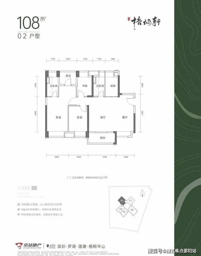 02户型108㎡的4房2厅2卫,设计的横厅南北通透格局,客餐厅6.2米宽。