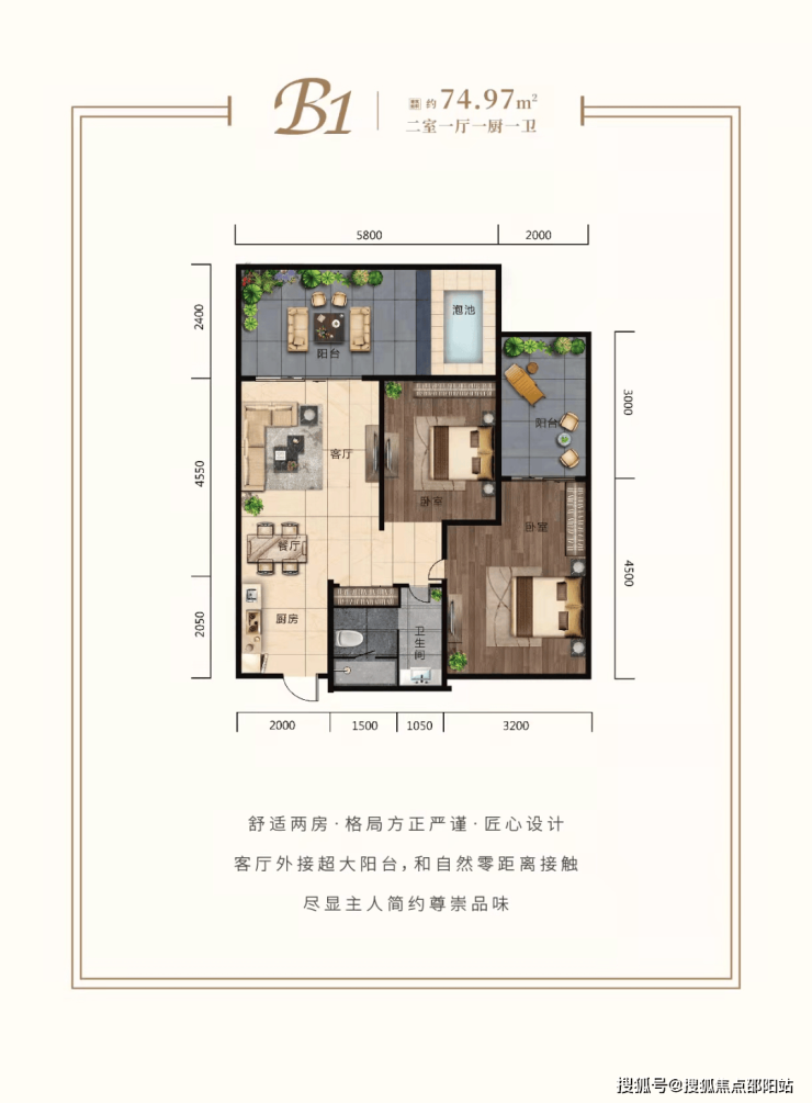 建筑面积约74.97㎡ 二室一厅一厨一卫