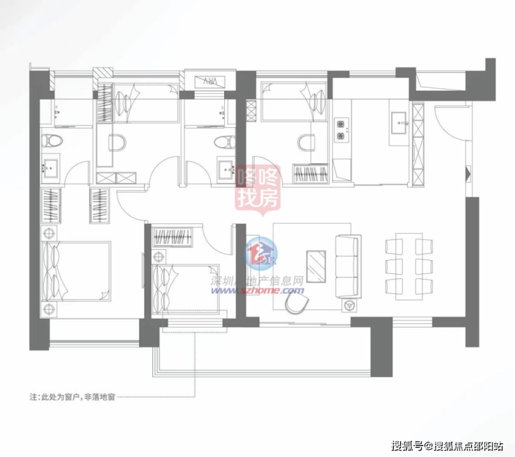 该户型每个空间都设有大采光面,自然通风采光性能良好。同时全屋采用全飘窗设计,包括卧室、厨房均利用凸窗做到了尺度的极致拓展。