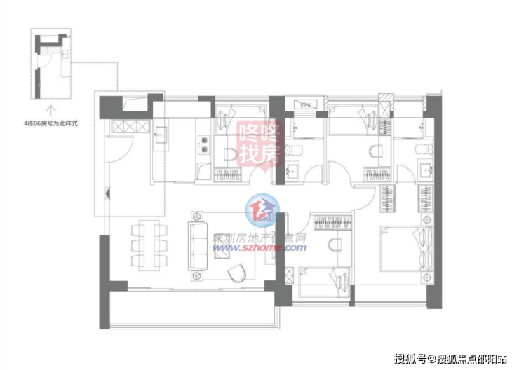 四房的D1,D2户型基本格局相同,采用客餐厅一体化设计。两者差别主要体现在,餐客出阳台,或是阳台延伸卧室窗户外。