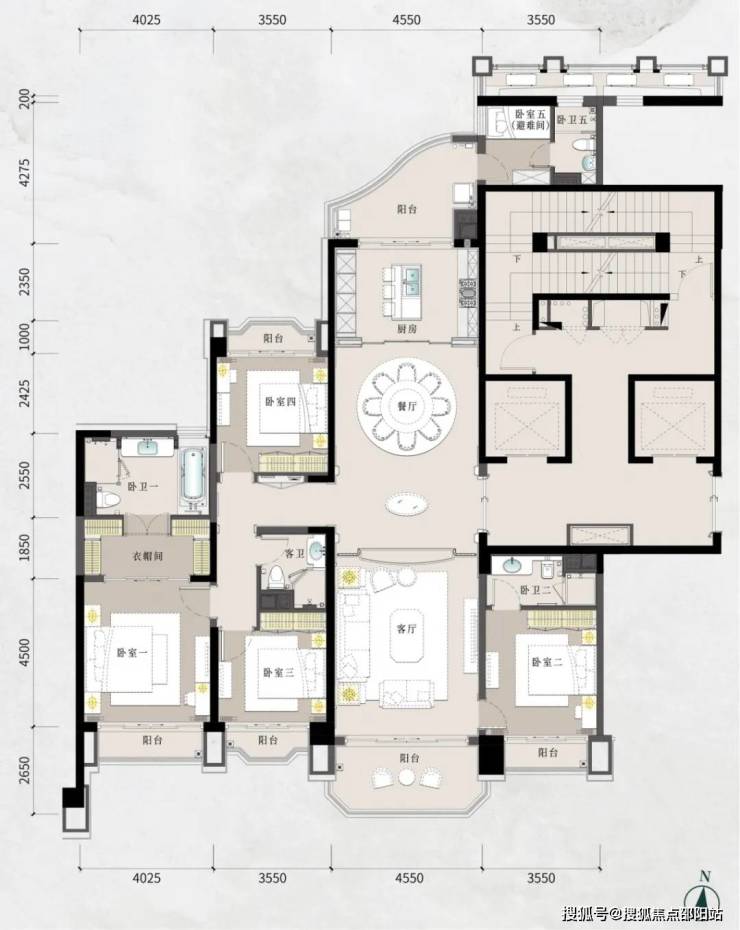 • 236-263㎡五房:南北通透,四开间朝南,客厅开间达5米,配备智能家居系统;