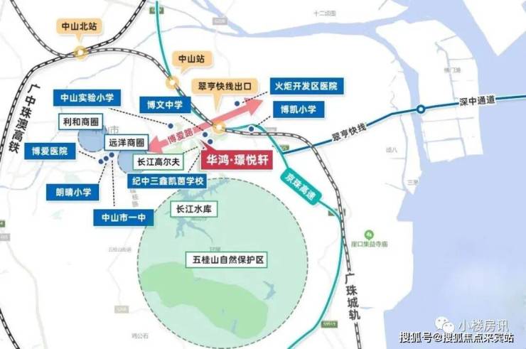 往西,则是城市主城,几乎相邻。众所周知,东区是中山房价的高企之地,教育、行政配套,一直为全市最优。
